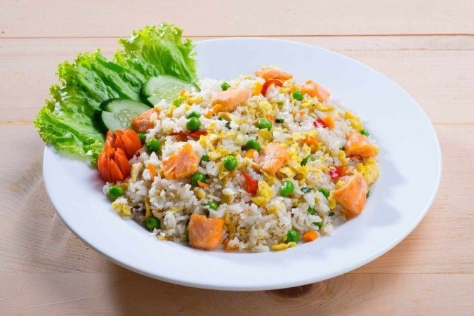 Em outra panela, adicione o azeite e aqueça em fogo médio. Adicione o alho e doure. Adicione as ervilhas, as cenouras e os pimentões e refogue por 5 minutos. Por último, adicione o arroz, os ovos e o salmão e misture bem. Refogue por mais 3 minutos e desligue o fogo. Sirva então.